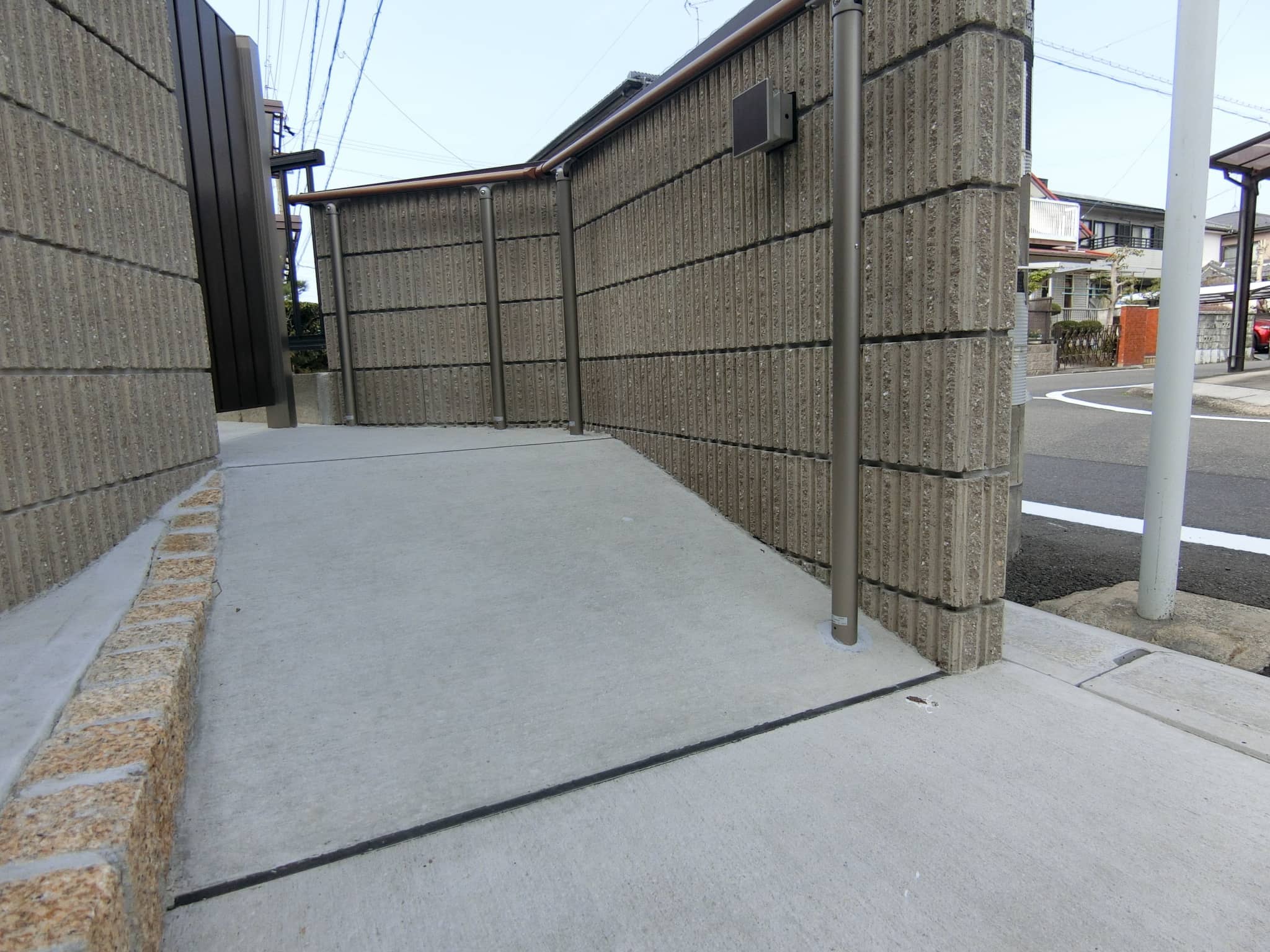 築40年以上のお住まいで、段差の多い外階段とブロック塀を撤去し、玄関まで1/12勾配のスロープと手すり、物干し場などを整えた事例です。
