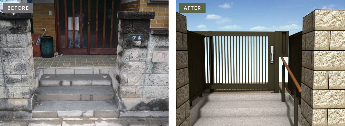 玄関前の急な階段を、蹴上げ約10cmの優しい階段と手すりに作り替えた事例です。