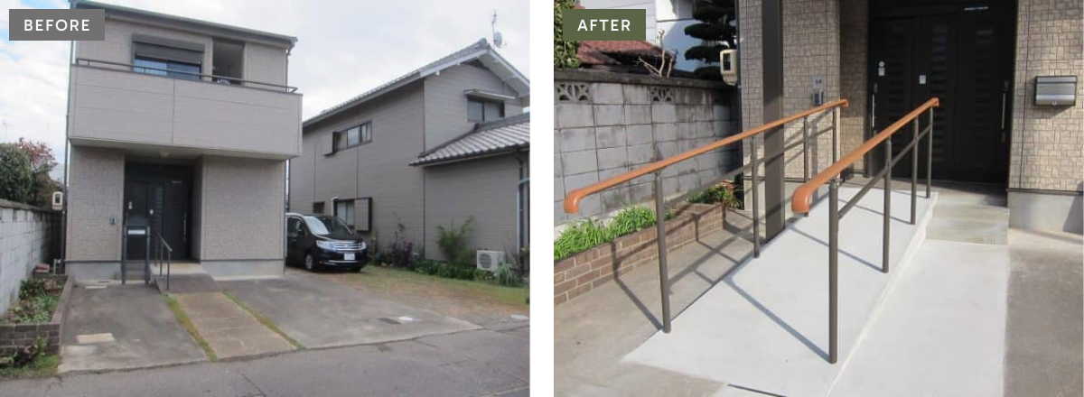 小牧市の介護リフォーム補助金を活用し、手すりやカーポートも含めて、安全に出入りできるアプローチを整えました。