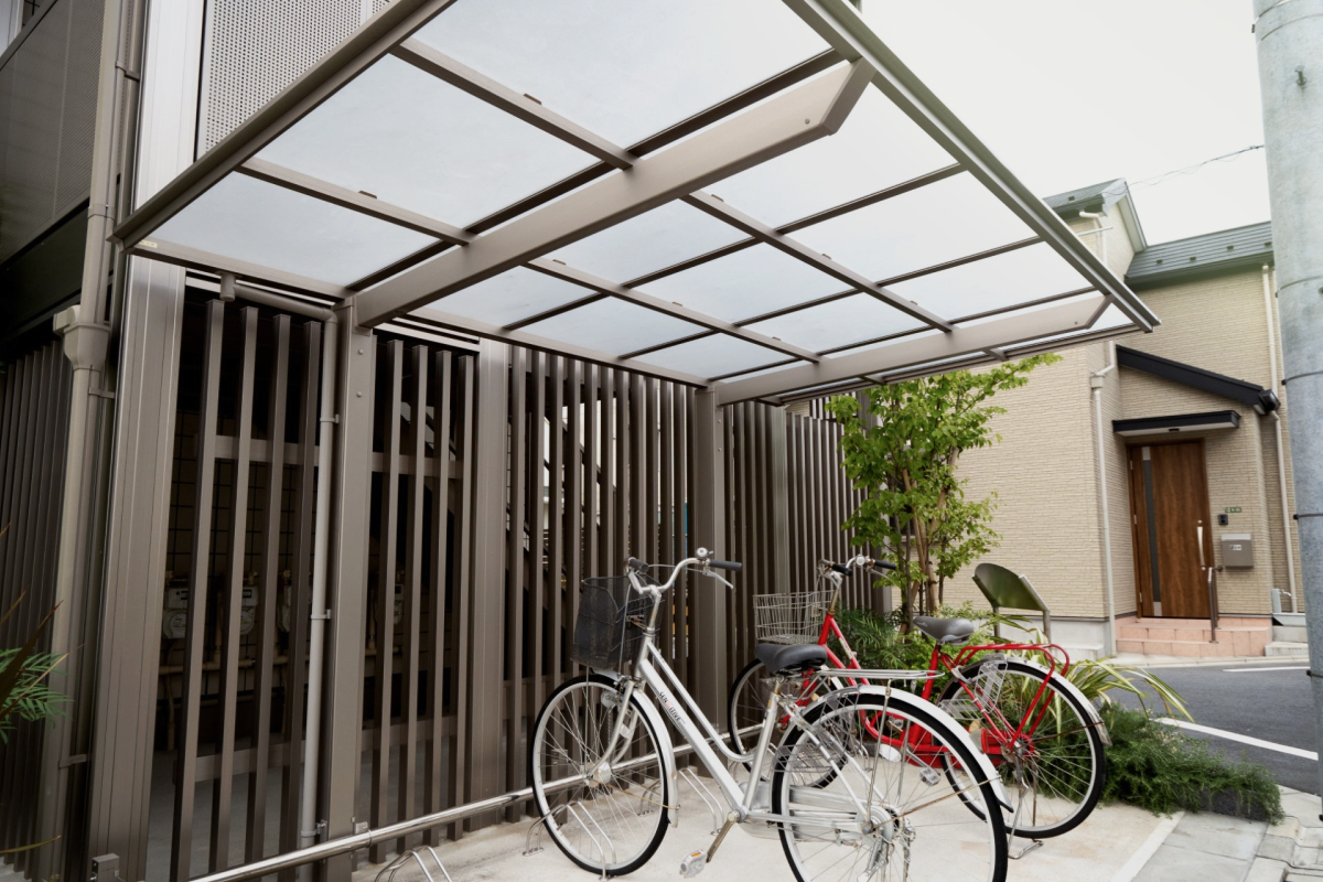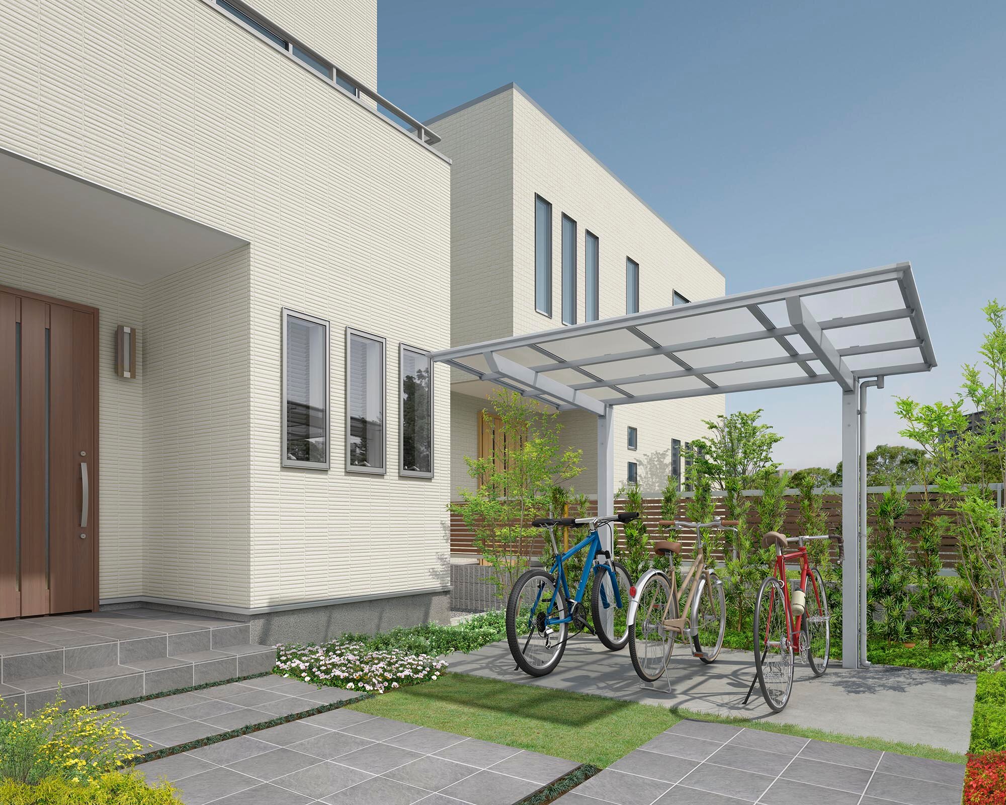 自転車4台以上を駐輪できる大きな屋根が必要というご要望から、三協アルミ『セルフィ ミニ』の5124サイズを2連結で設置しました。