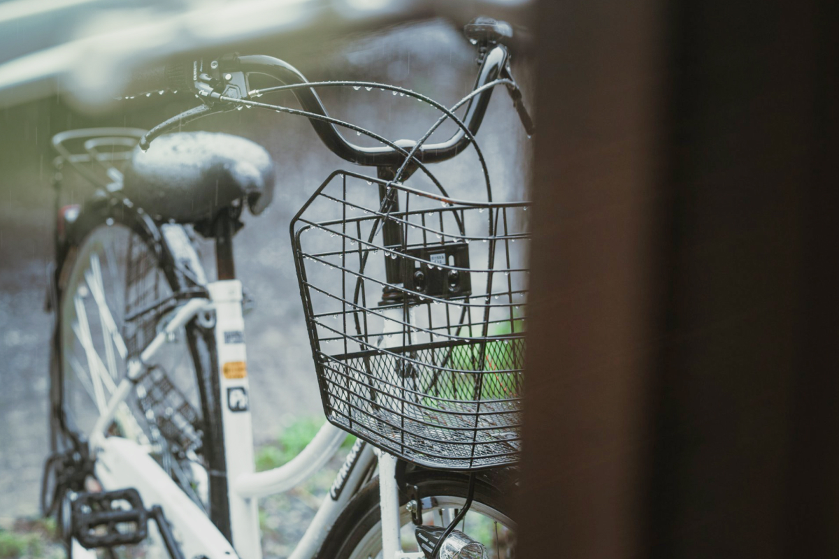 「行ってきます!」と元気に飛び出したのに、自転車が倒れていて出しにくい…雨でサドルがびしょ濡れ…。