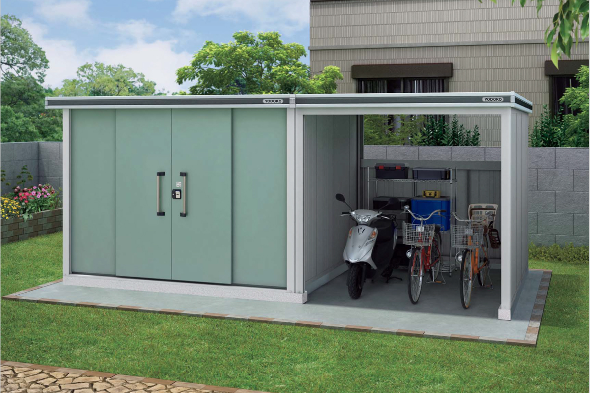 大型物置の側面に駐輪スペースを連結した画期的な商品です。