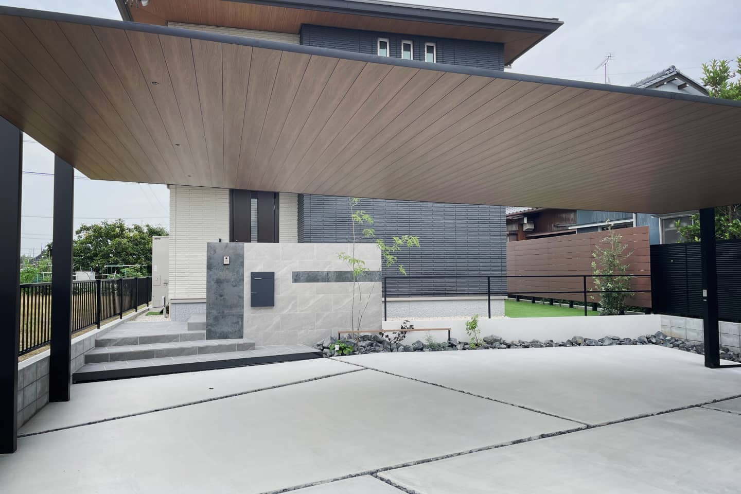 旗竿地の奥にある敷地ですが、吊り下げ式のおしゃれなカーポート「Uスタイルアゼスト」を設置し、木目調の天井材とダウンライトで高級感を演出しました。