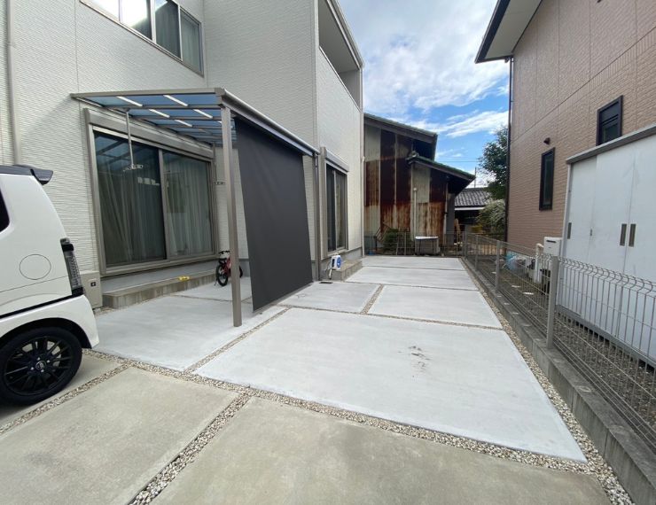 もともと庭木やブロック塀があった場所を撤去・整地し、既存の駐車場と高さを揃えてコンクリートで舗装しました。