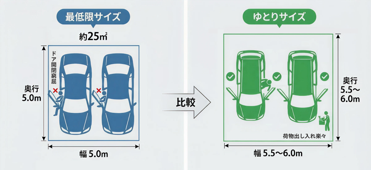 ただし、これは最低限のサイズなので、乗り降りや荷物の出し入れを考えると幅5.5m〜6.0m×奥行5.5m〜6.0m程度あるとゆとりを持って使えます。