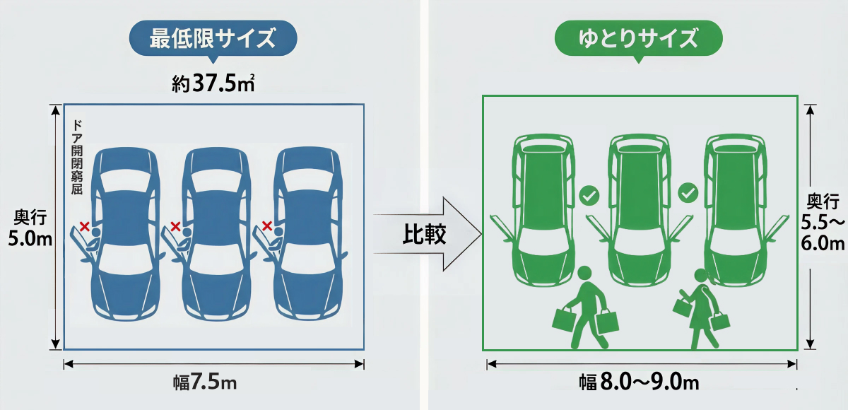 3台並列で停める場合、幅7.5m×奥行5.0mが最低限必要です。
