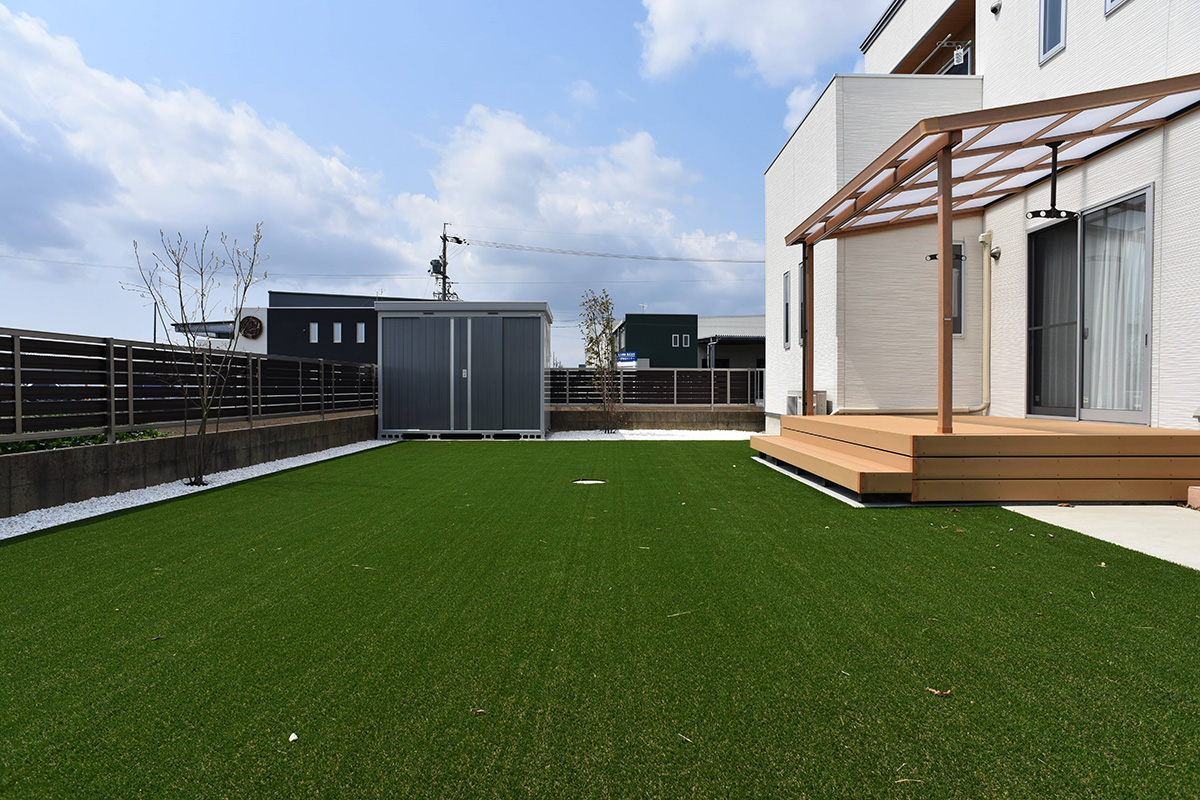 そこで、手入れが大変な土の部分は人工芝でカバーし、リビングから続くウッドデッキとテラスを設置。