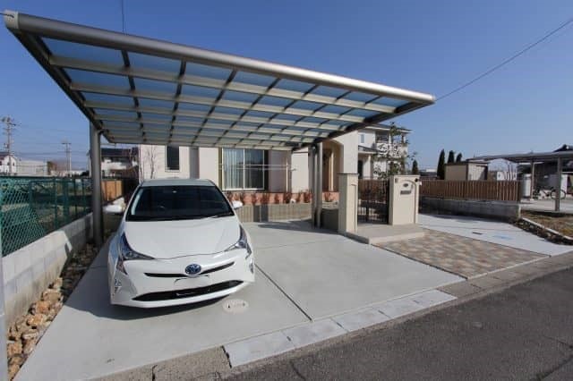 カースペース2台+ゲスト用1台必要の為、4本柱カーポートは却下し、後方支持の2本足カーポート、三協アルミ4Gを採用