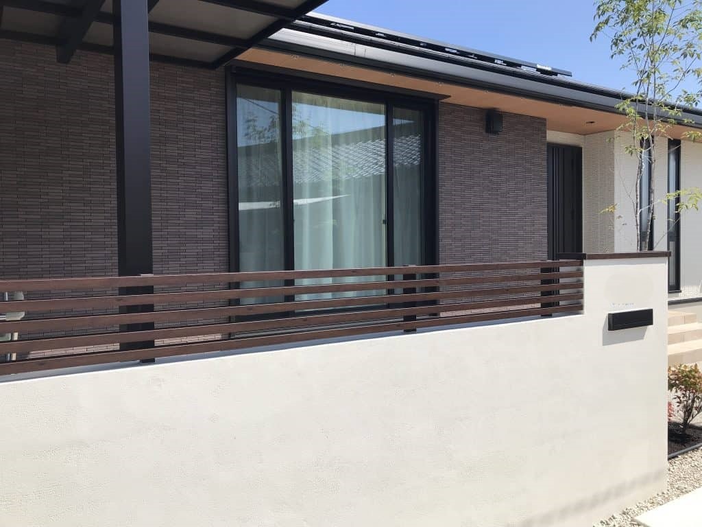 門袖は外壁に合わせてアイボリー色とし、木目のデザイン笠木を入れて高級感とデザイン性を高めています。