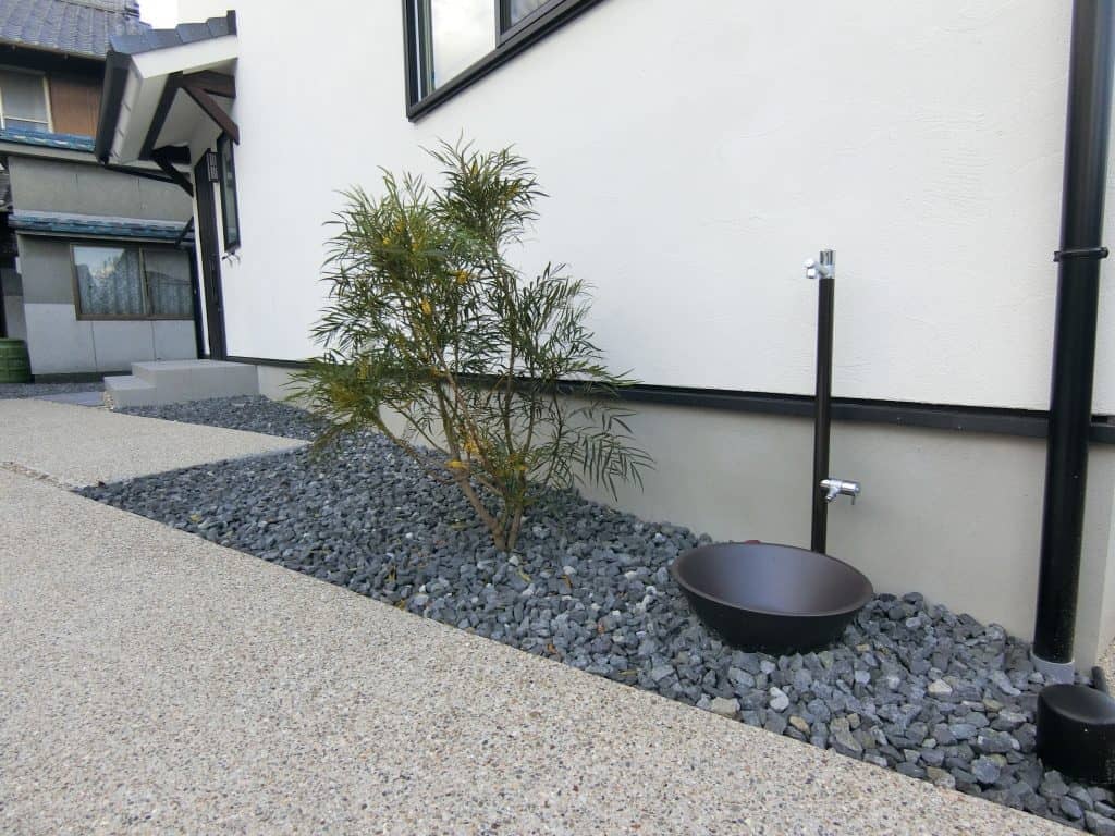 清須市 和風住宅の外構工事 投稿日:2019.11.15 最終更新日:2025.09.16 新築外構クローズ外構モダン外構和モダン門・アプローチ門扉・門柱駐車場・カーポートシャッター・ゲート愛知県清須市 愛知県清須市 木造住宅のエクステリア施工例 代々続く敷地の一角にその景観になじむ和風住宅。 建物の白い外壁がとても美しく印象的でしたので 外構も「うつくしい白」をテーマにデザインしました。 白く塗った門袖にアクセントになる黒ピンコロを使用して花壇を配置和風デザイン 出入口の角度、配置はお車での出入りができるだけ入りやすいように考え配置しました。 オーナー様が選ばれたLED内蔵のサインは夜は美しく光ります (MINO AR-32) シンプルな立水栓のわきにマホニアセイリュウが似合います (立水栓Only One ジラーレ2口タイプはホースを繋なぎっぱなしでもOK) 和風外の水道とマホニア 施工概要 施工タイプ新築外構施工内容門・アプローチ, 門扉・門柱, 駐車場・カーポート, シャッター・ゲート外構デザインクローズ外構, モダン外構, 和モダンエリア愛知県, 清須市 事例一覧へ戻る この記事をシェアする