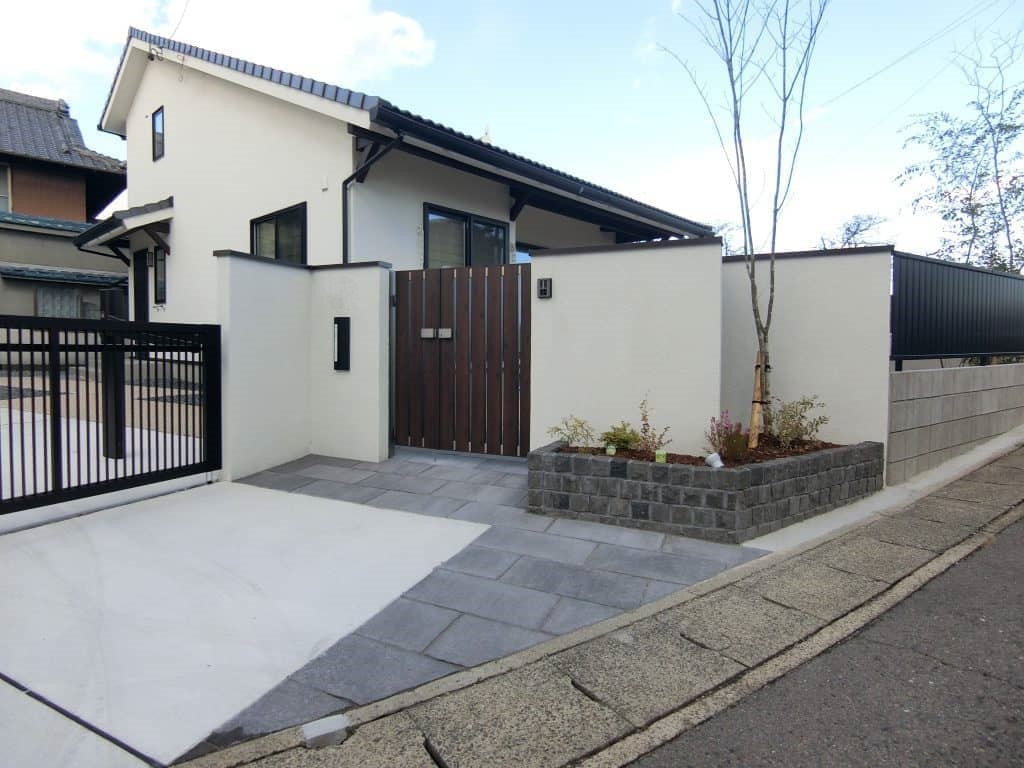 清須市 和風住宅の外構工事 投稿日:2019.11.15 最終更新日:2025.09.16 新築外構クローズ外構モダン外構和モダン門・アプローチ門扉・門柱駐車場・カーポートシャッター・ゲート愛知県清須市 愛知県清須市 木造住宅のエクステリア施工例 代々続く敷地の一角にその景観になじむ和風住宅。 建物の白い外壁がとても美しく印象的でしたので 外構も「うつくしい白」をテーマにデザインしました。 白く塗った門袖にアクセントになる黒ピンコロを使用して花壇を配置和風デザイン 出入口の角度、配置はお車での出入りができるだけ入りやすいように考え配置しました。 オーナー様が選ばれたLED内蔵のサインは夜は美しく光ります (MINO AR-32) シンプルな立水栓のわきにマホニアセイリュウが似合います (立水栓Only One ジラーレ2口タイプはホースを繋なぎっぱなしでもOK) 和風外の水道とマホニア 施工概要 施工タイプ新築外構施工内容門・アプローチ, 門扉・門柱, 駐車場・カーポート, シャッター・ゲート外構デザインクローズ外構, モダン外構, 和モダンエリア愛知県, 清須市 事例一覧へ戻る この記事をシェアする