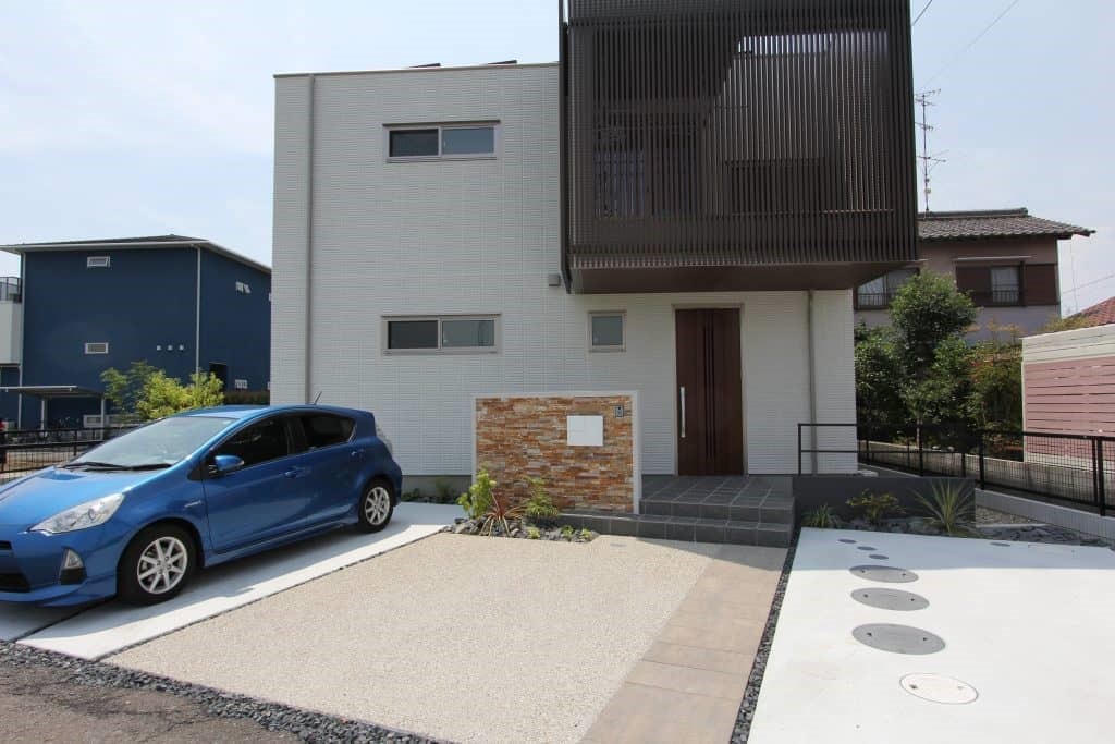 スクエアなデザインが特徴のへーベル住宅。今回はありふれたグレー系の無彩色の外構提案ではなく