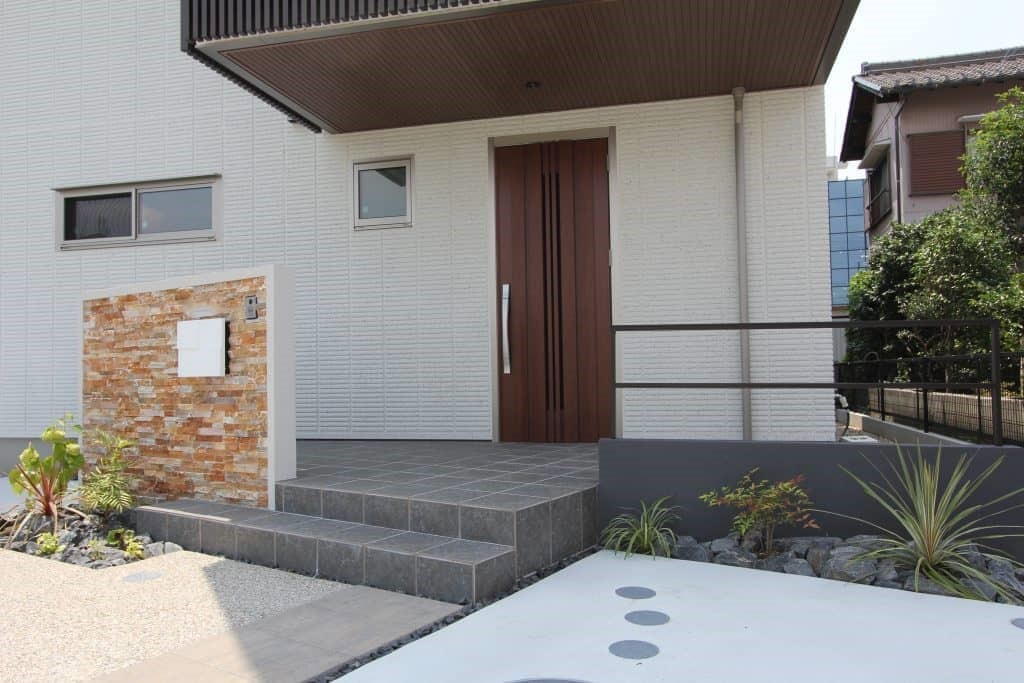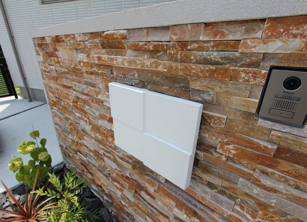 幾何学調のモダンポストを採用しました。自然な天然石と幾何学模様の融合もかっこいいです。