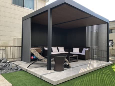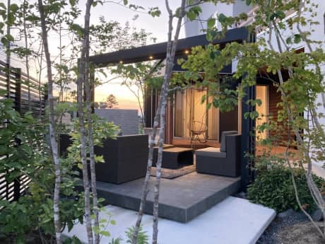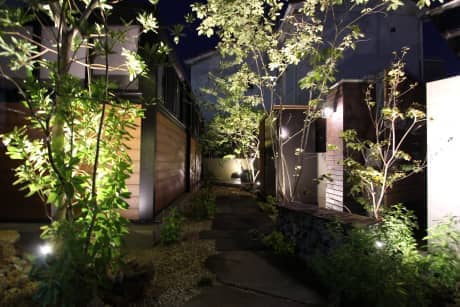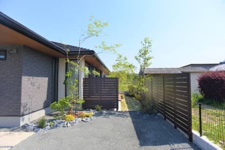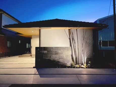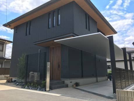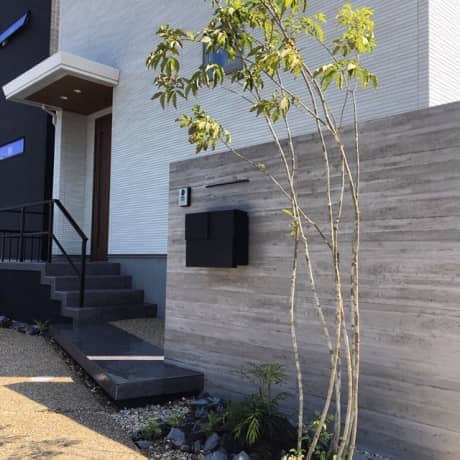 春日井市外構工事 積水ハウスの家 屋根付き門の外構 テラス・デッキ門・アプローチ塀・フェンスライティング・間接照明庭・植栽駐車場・カーポート クローズ外構モダン外構和モダン宅配ボックス門柱・タイル愛知県春日井市