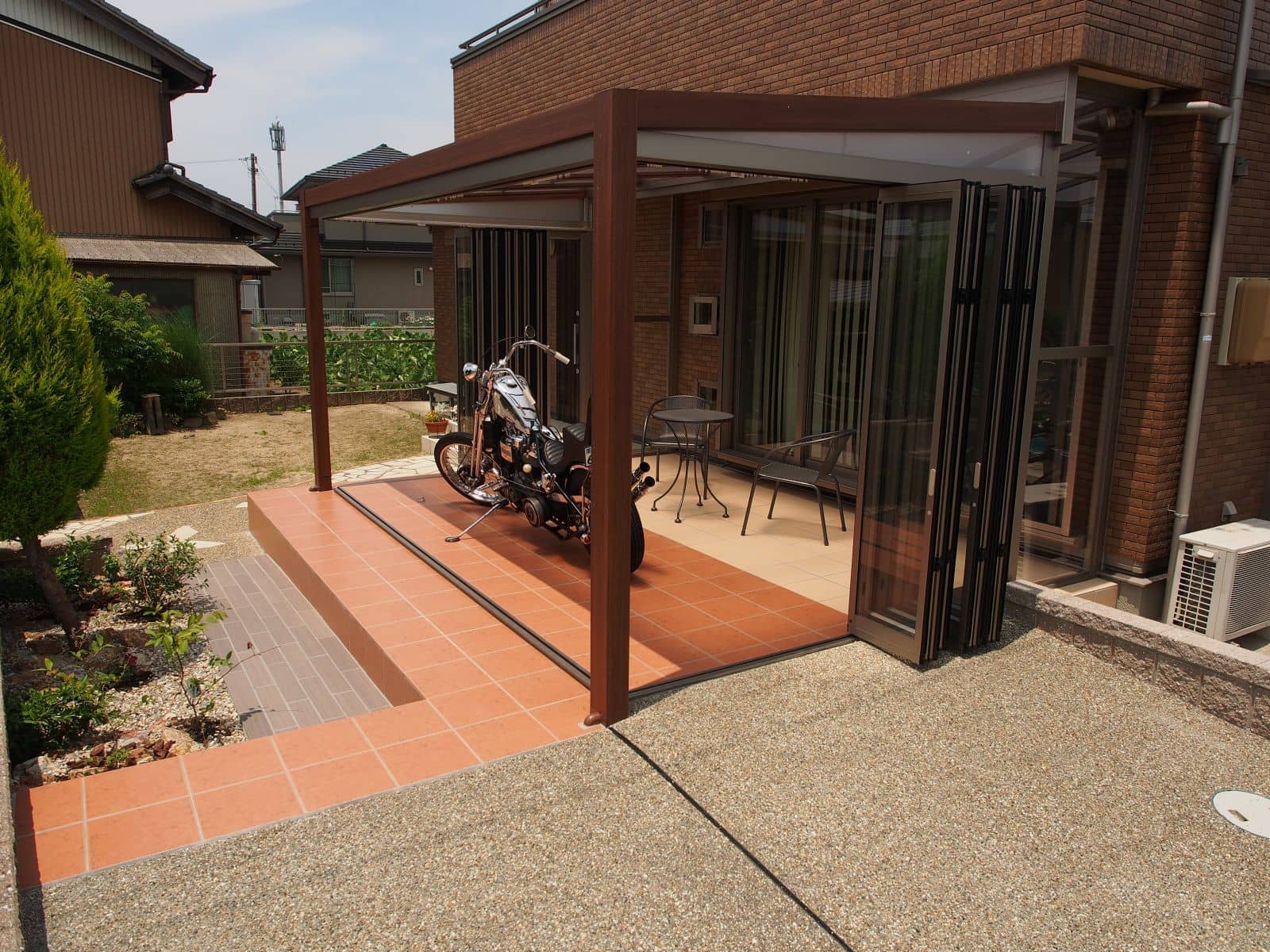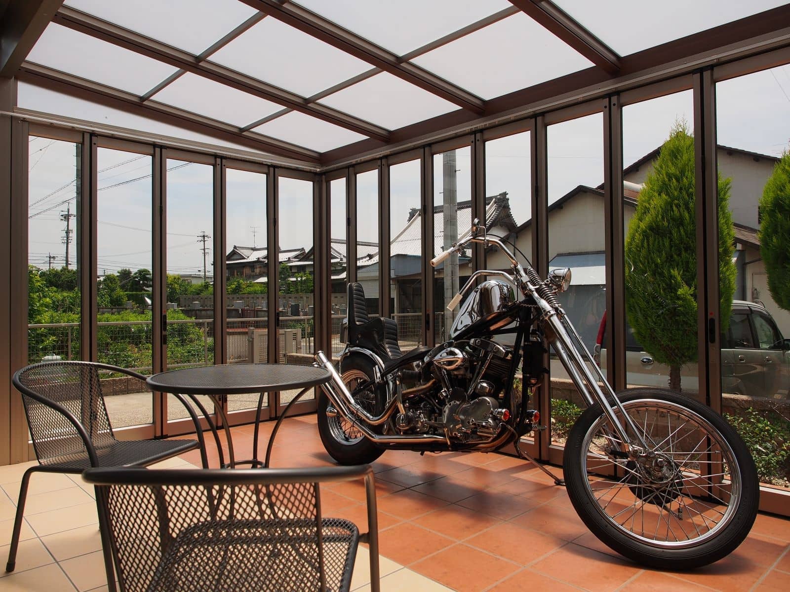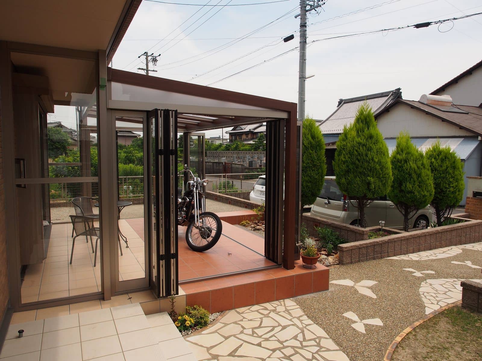 設置場所が日当たりの良い南面に限定されるため思い切ってガーデンルーム兼用のガレージとしました。